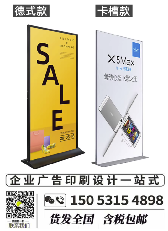 该展架可双面展示,多用于高端商场和品牌活动中。该展架全身都是纯铝合金材质,无边框设计,是目前广告界高端的展示展架之一。